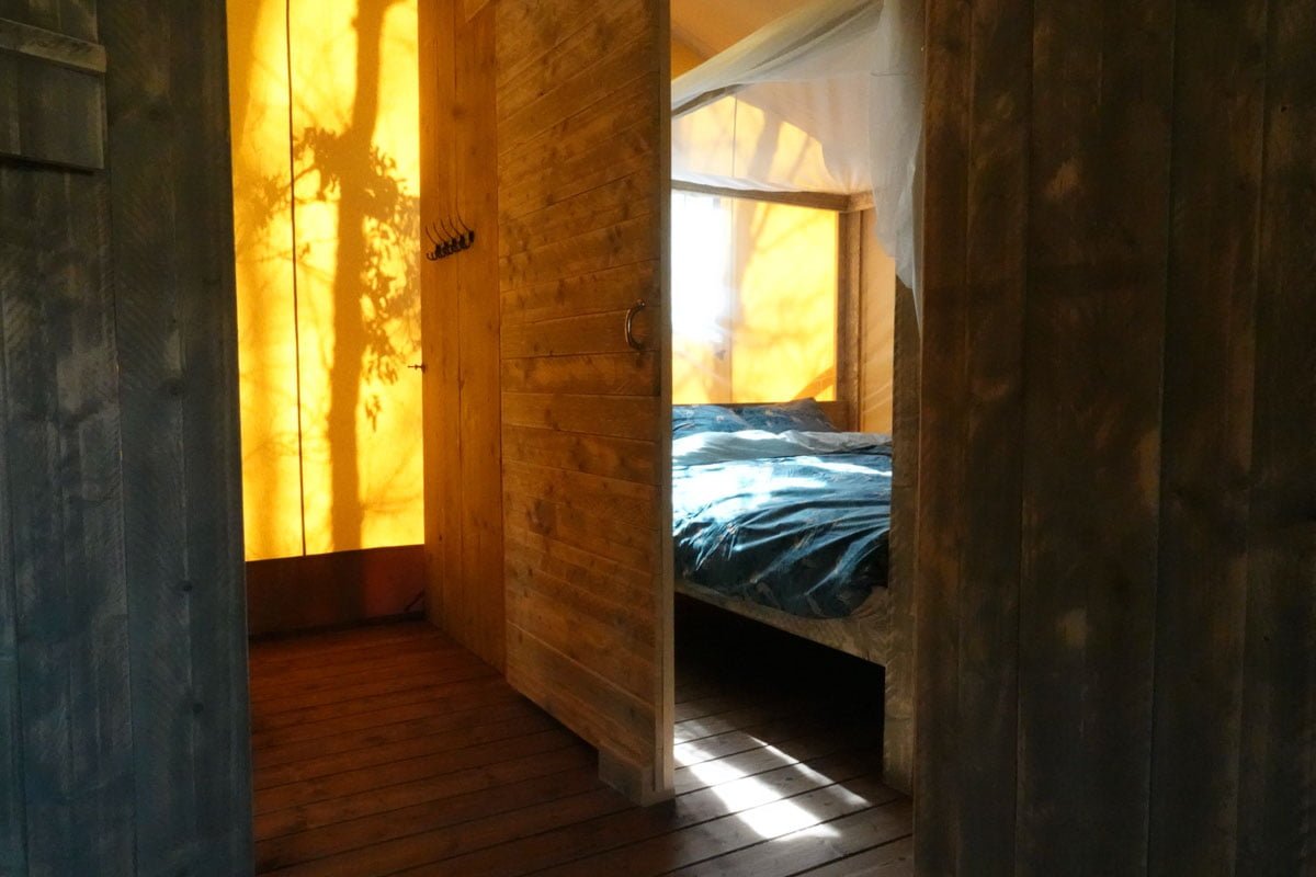 A l’intérieur de votre chalet, parois en bois et portes coulissantes séparent différentes pièces, à savoir 1 lit double à baldaquins, 1 chambre avec lit superposé, 1 lit-coffre pour 2 personnes, 1 salle de bains avec douche, lavabo et toilettes ainsi qu’une cuisine équipée et un coin repas.